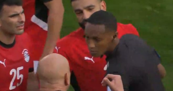 2025年非洲杯第二轮比赛,埃及对阵南非。上半场结束时,裁判做出了一系列颇具争议的判罚,禁区内击中萨拉赫眼睛后判罚点球,随后红牌罚下哈尼。比赛第39分钟,萨拉赫杀入禁区,穆达乌打在他脸上。裁判没有判罚点球。随后,视频助理裁判介入做出判罚决定,并要求裁判回放慢镜头。从慢镜头来看,穆达乌举起右手,击中了萨拉赫的眼睛。看完慢镜头,主裁判罚点球,先是向抗议的福斯特出示黄牌,后又向犯规的穆达乌出示黄牌。这个判罚让南非球员非常沮丧,围着裁判争论了很长时间。虽然从穆达乌犯规到萨拉赫罚点球花了5分钟,但上半场补时仅2分钟。补时阶段,裁判再次做出了有争议的判罚。边线防守时,哈尼从后面踢倒了莫科纳。裁判先是向哈尼出示了一张黄牌,随后又出示了红牌。因为这个判罚,埃及球员们非常不满。马尔穆什和萨拉赫都向裁判提出抗议。从慢镜头来看,哈尼的右脚稳稳地踩在了莫科纳的右脚上。裁判向哈尼出示第二张黄牌是合理的。